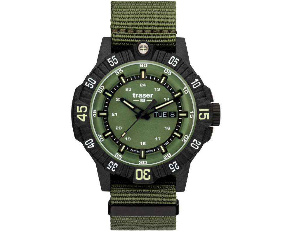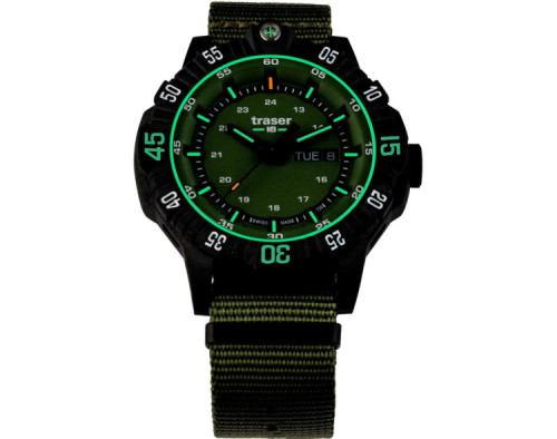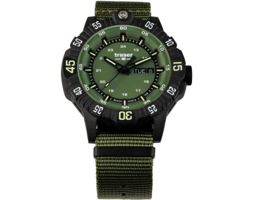 Montre bracelet Traser 110726 pour Homme à Quartz, avec une boîtier de Acier inoxydable d’un diamètre de 46 mm, avec un cadran Vert et avec un bracelet de Tissu en couleur Vert.