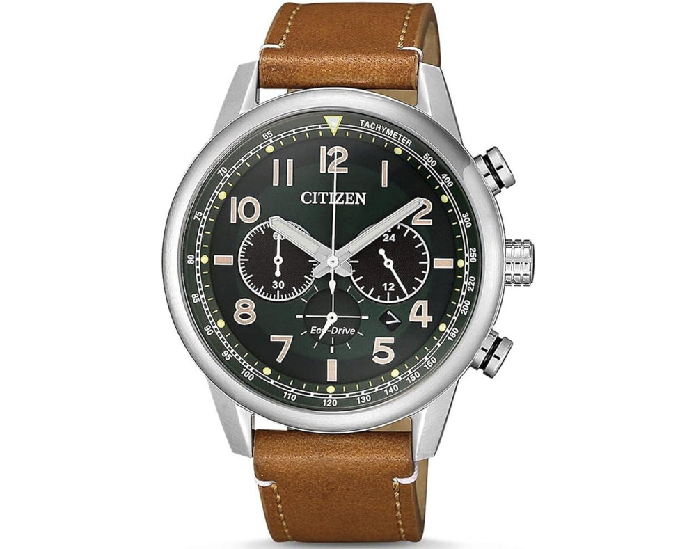Montre bracelet Citizen Eco-Drive Sport CA4420-21X pour Homme à Quartz, avec une boîtier de Acier inoxydable d’un diamètre de 45 mm, avec un cadran Vert et avec un bracelet de Cuir en couleur Marron.