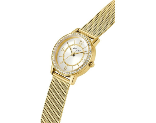 Orologio da polso Guess Melody GW0534L2 Analogico Donna con movimento Al quarzo, cassa in Acciaio inossidabile di diametro 28 mm, quadrante Argento, vetro Minerale e cinturino in Maglia milanese di colore Oro.