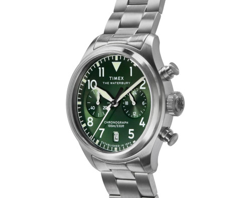 Orologio da polso Timex Waterbury TW2Y19100UK Cronografo Uomo con movimento Al quarzo, cassa in Acciaio inossidabile di diametro 41 mm, quadrante Verde, vetro Minerale e cinturino in Acciaio inossidabile di colore Argento.