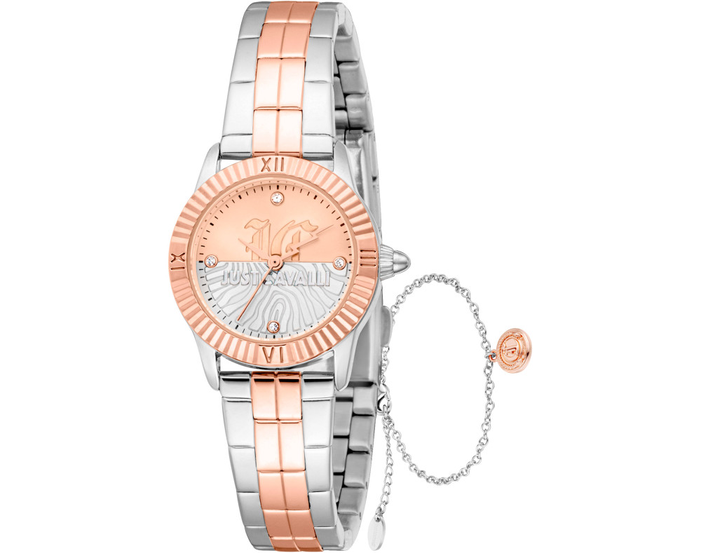 Kvarcas Moteris Rankinis laikrodis Just Cavalli JC1L328M0095 su Nerūdijantis plienas dėklu, 26 mm skersmens, Mineralinis stiklas, Daugiaspalvis ciferblatu ir Dviejų atspalvių Nerūdijantis plienas apyranke.