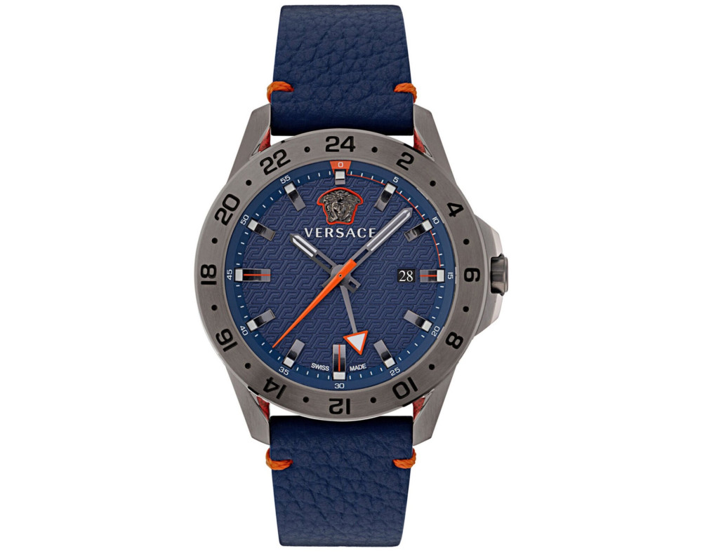 Kvarcas Vyras Rankinis laikrodis Versace VE2W00222 su Nerūdijantis plienas dėklu, 45 mm skersmens, Mineralas su safyru stiklas, Mėlyna ciferblatu ir Mėlyna Oda apyranke.