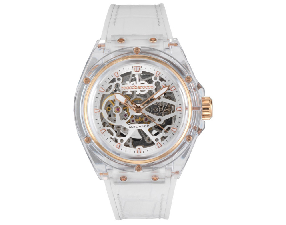 Mechaninis Vyras Rankinis laikrodis Roccobarocco RB.3249M-02 su Plastmasinis dėklu, 45 mm skersmens, Mineralinis stiklas, Pilka ciferblatu ir Baltas Silikonas apyranke.