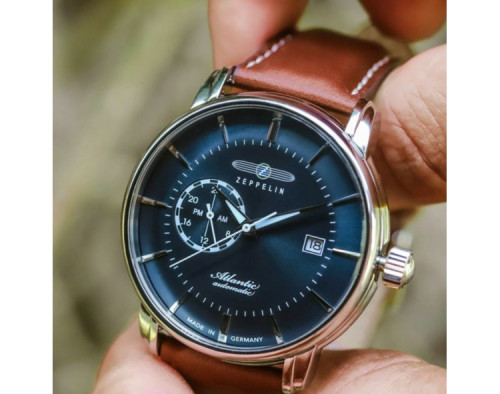 Mechaninis Vyras Rankinis laikrodis Zeppelin 8470-3 su Nerūdijantis plienas dėklu, 41 mm skersmens, Mineralinis K1 stiklas, Mėlyna ciferblatu ir Ruda Oda apyranke.