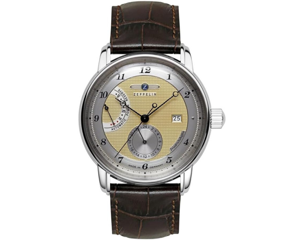 Mehānisks Cilvēks Rokas pulkstenis Zeppelin 8590-5 ar Nerūsējošais tērauds korpusu, ar diametru 42 mm, Minerāls K1 stikls, Zelts ciparnīcu un Brūns Āda siksnu.