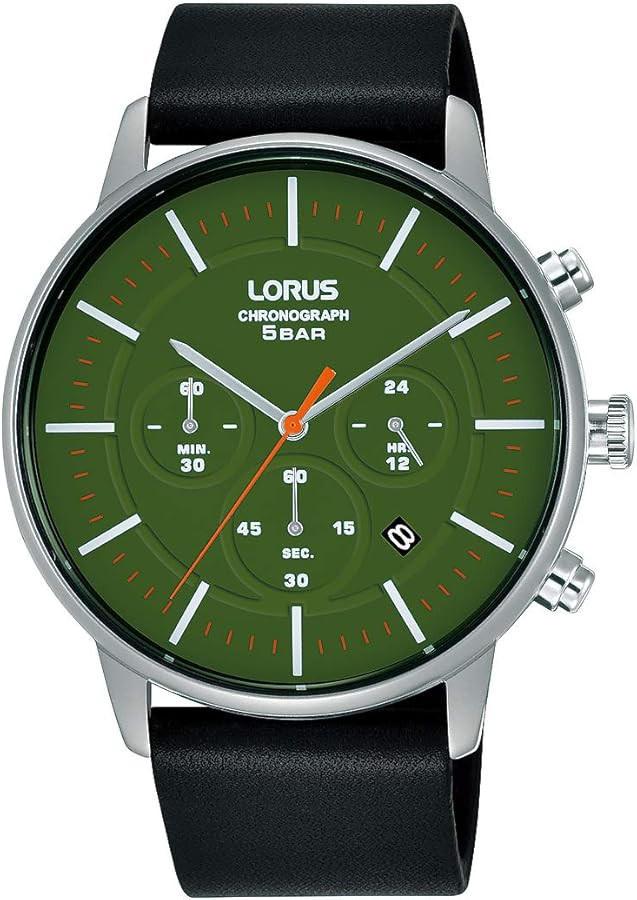 Kvarcs Cilvēks Rokas pulkstenis Lorus RT309JX9 ar Nerūsējošais tērauds korpusu, ar diametru 43 mm, Minerāls stikls, Zaļš ciparnīcu un Melns Āda siksnu.