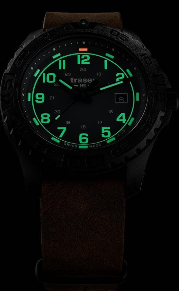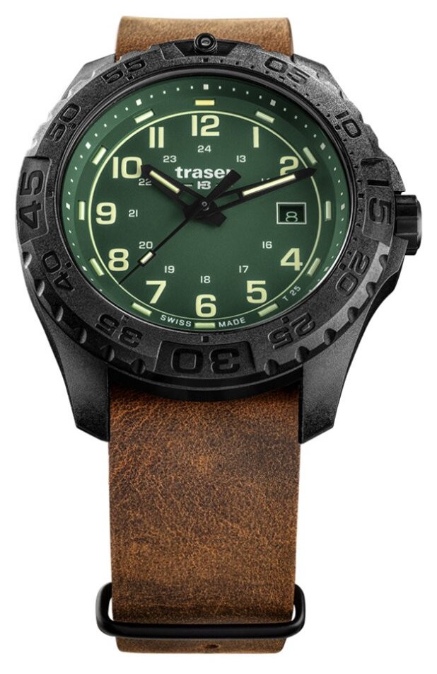 Kvarcs Cilvēks Rokas pulkstenis Traser 109038 ar Plastmasa korpusu, ar diametru 44 mm, Minerāls ar safīru apstrādi stikls, Zaļš ciparnīcu un Brūns Āda siksnu.