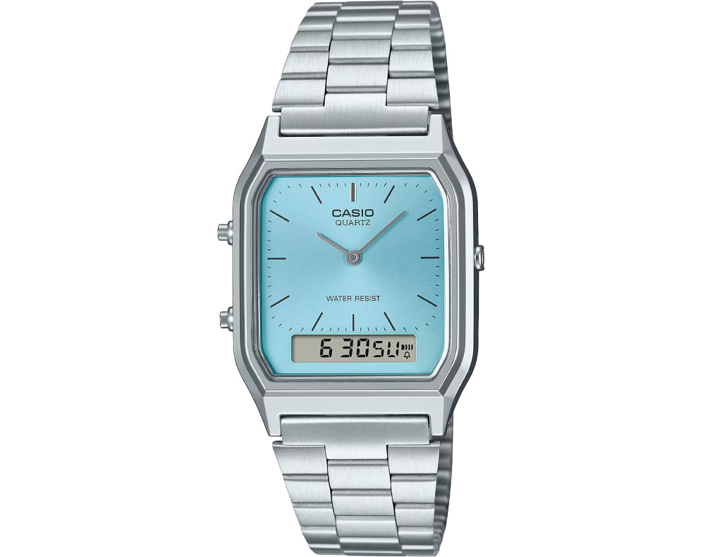 Кварц унисекс Наручные часы Casio AQ-230A-2A1MQYES, корпус Смола, диаметр 28 mm, Пластик стекло, Голубое небо циферблат и Серебро Нержавеющая сталь ремешок.