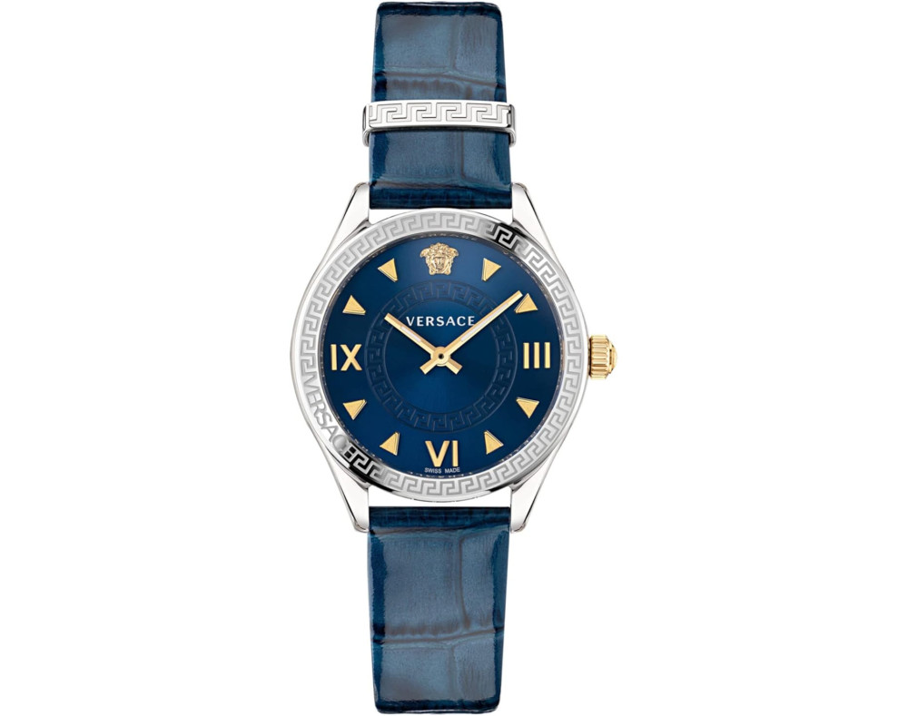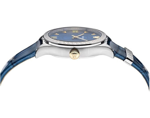 Кварц Женщина Наручные часы Versace VE2S00122, корпус Нержавеющая сталь, диаметр 36 mm, Минерал с обработкой сапфиром стекло, Синий циферблат и Синий Кожа ремешок.