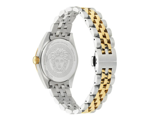 Armbanduhr Versace V-Code VE8I00424 für Damen mit Quarzwerk, Uhrengehäuse aus Edelstahl mit einem Durchmesser von 36 mm, Ziffernblatt Grün und Uhrenarmband aus Edelstahl in der Farbe Zweifarbig.