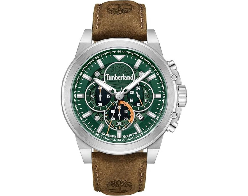 Armbanduhr Timberland Fast Strike TDWGB0056001 für Herren mit Quarzwerk, Uhrengehäuse aus Edelstahl mit einem Durchmesser von 46 mm, Ziffernblatt Grün und Uhrenarmband aus Leder in der Farbe Braun.
