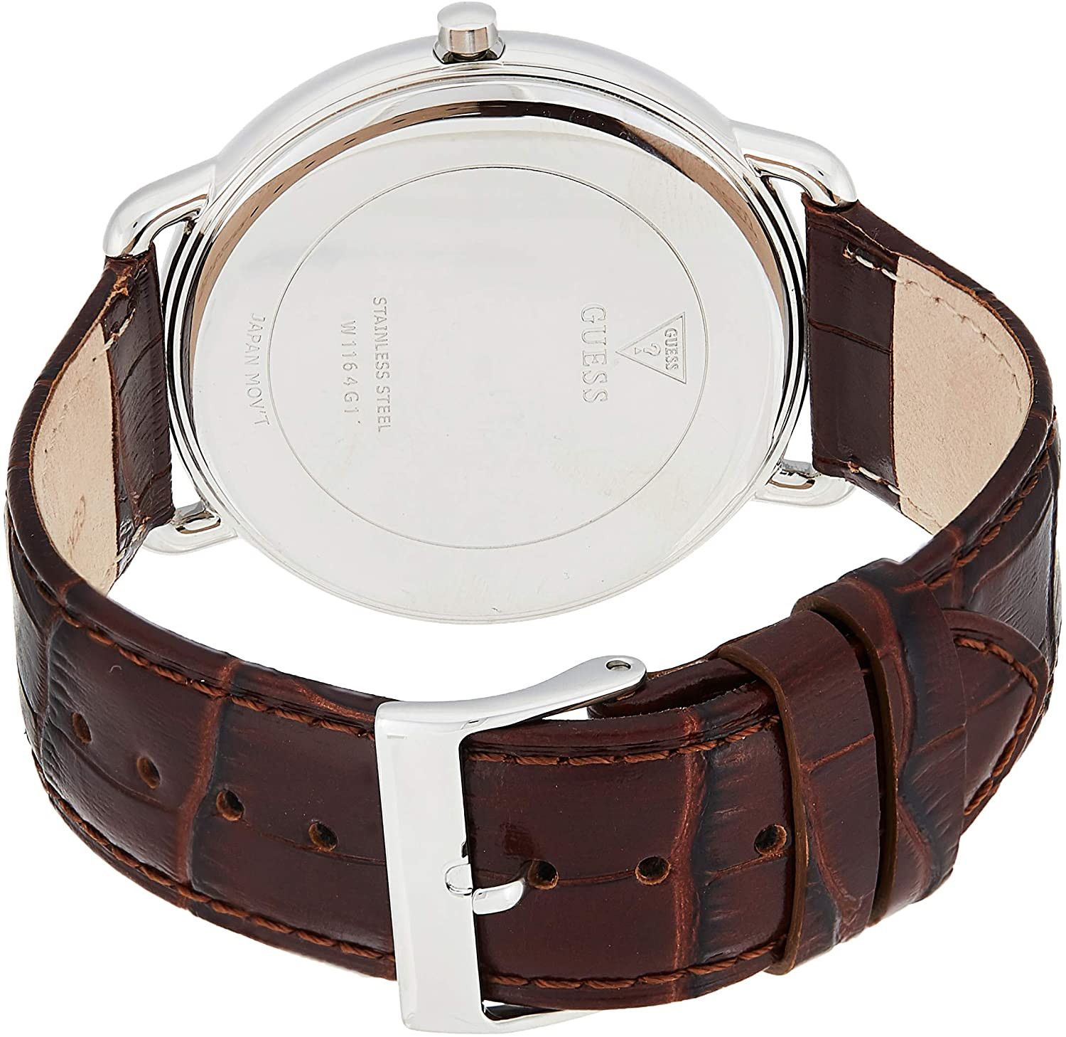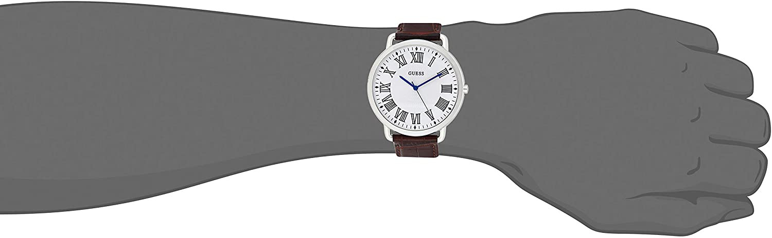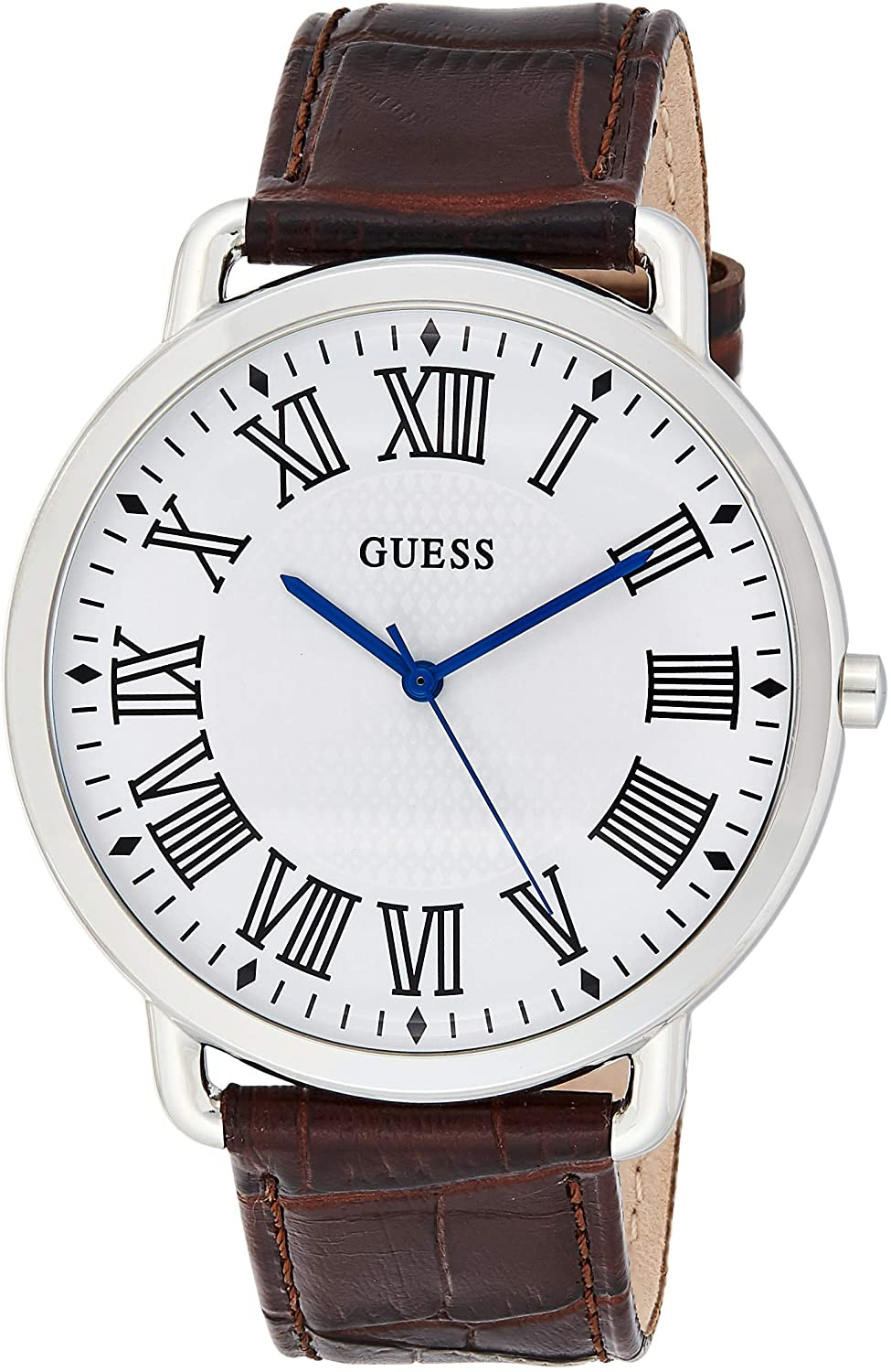 Armbanduhr Guess W1164G1 für Herren mit Quarzwerk, Uhrengehäuse aus Edelstahl mit einem Durchmesser von 43 mm, Ziffernblatt Weiß und Uhrenarmband aus Leder in der Farbe Braun.