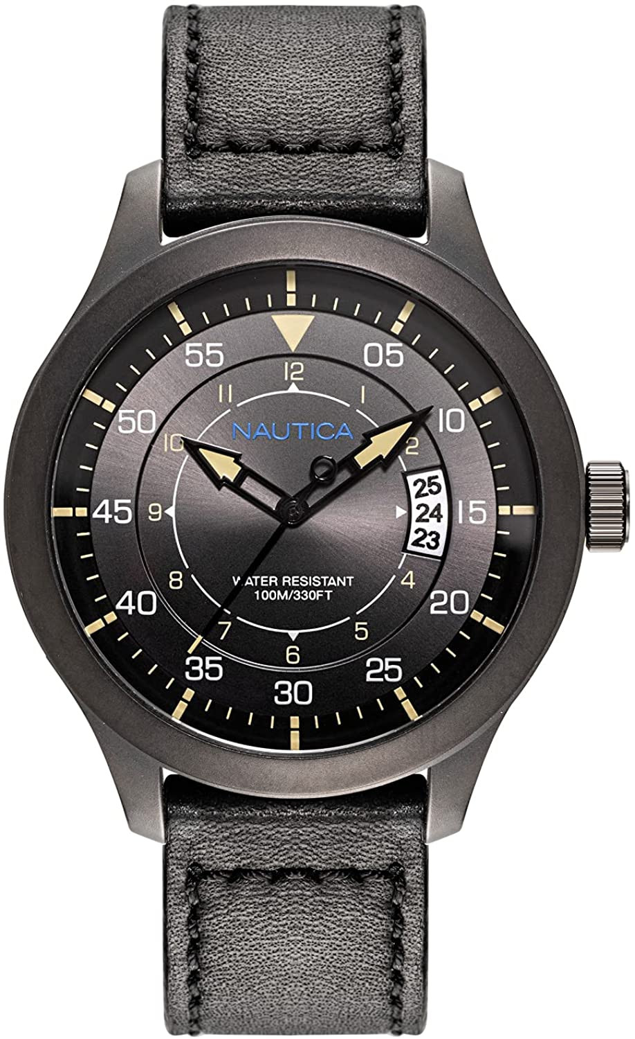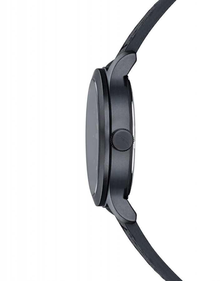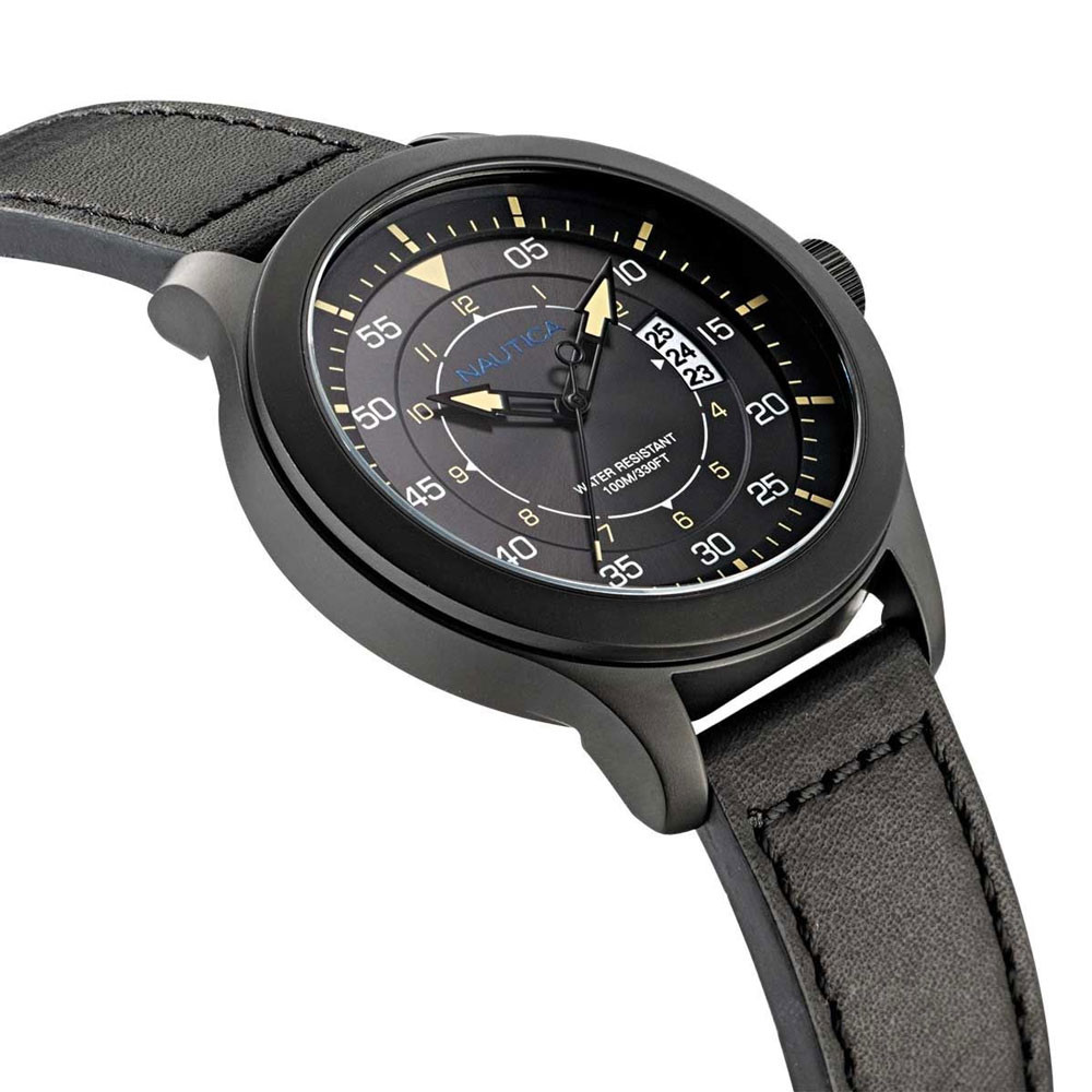 Armbanduhr Nautica Point Loma NAPPLP905 für Herren mit Quarzwerk, Uhrengehäuse aus Edelstahl mit einem Durchmesser von 45 mm, Ziffernblatt Schwarz und Uhrenarmband aus Leder in der Farbe Schwarz.