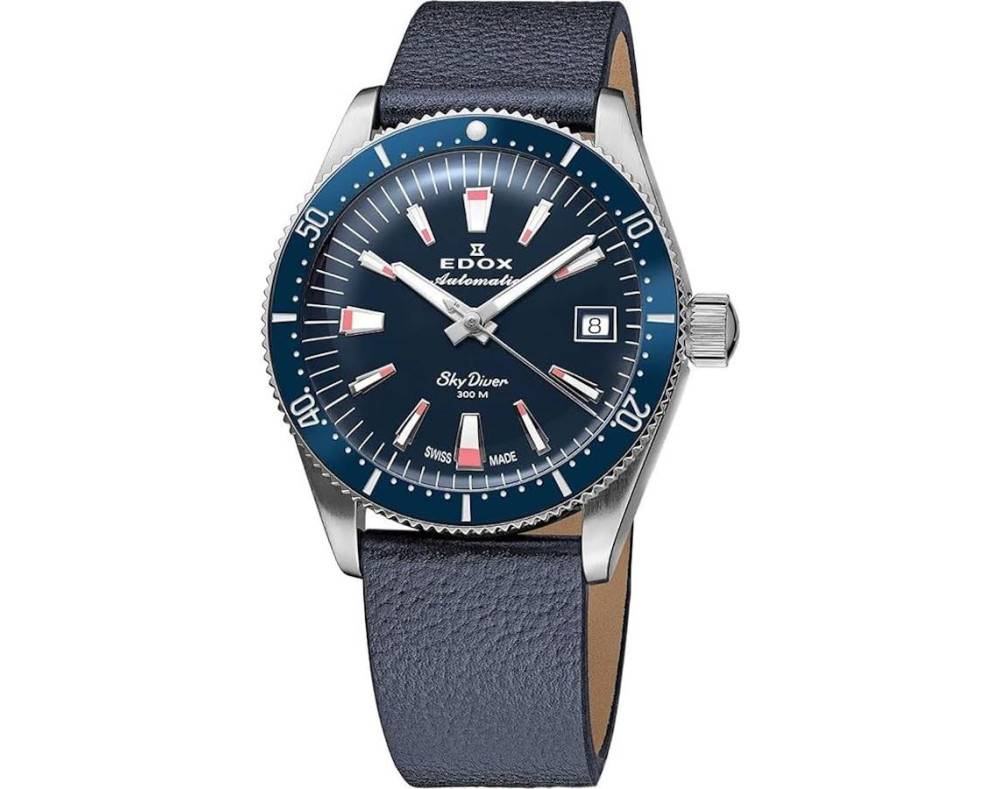 Armbanduhr EDOX Skydiver Set 80131-3BUC-BUICO für Damen mit Mechanisch, Uhrengehäuse aus Edelstahl mit einem Durchmesser von 38 mm, Ziffernblatt Blau und Uhrenarmband aus Leder in der Farbe Blau.