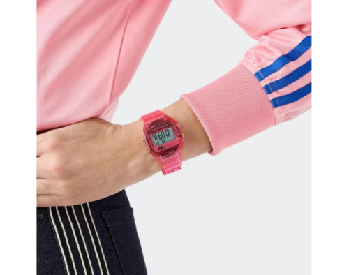 Armbanduhr Adidas Digital Two Crystal AOST25540 für Unisex mit Quarzwerk, Uhrengehäuse aus Resin mit einem Durchmesser von 36 mm, Ziffernblatt Pink und Uhrenarmband aus Resin in der Farbe Pink.