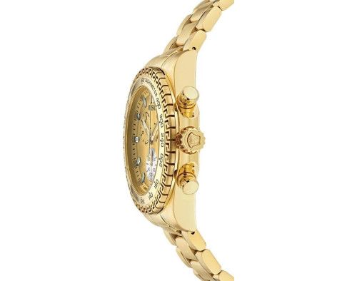 Armbanduhr Versace Chrono-X VE9K01324 für Herren mit Quarzwerk, Uhrengehäuse aus Edelstahl mit einem Durchmesser von 44 mm, Ziffernblatt Gold und Uhrenarmband aus Edelstahl in der Farbe Gold.