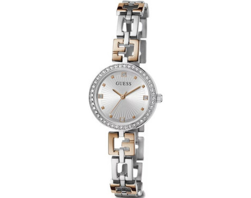 Armbanduhr Guess Lady G GW0656L2 für Damen mit Quarzwerk, Uhrengehäuse aus Edelstahl mit einem Durchmesser von 26 mm, Ziffernblatt Silber und Uhrenarmband aus Edelstahl in der Farbe Zweifarbig.