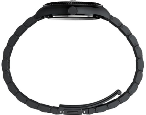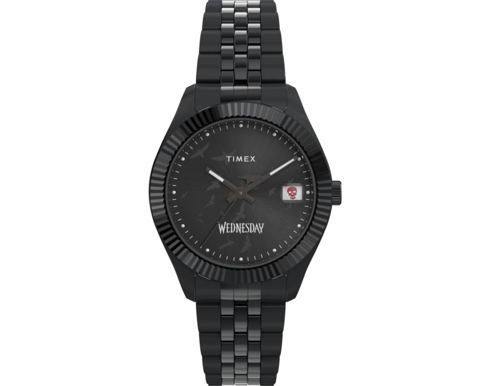 Armbanduhr Timex x Wednesday TW2Y19600QY für Unisex mit Quarzwerk, Uhrengehäuse aus Edelstahl mit einem Durchmesser von 36 mm, Ziffernblatt Schwarz und Uhrenarmband aus Edelstahl in der Farbe Schwarz.