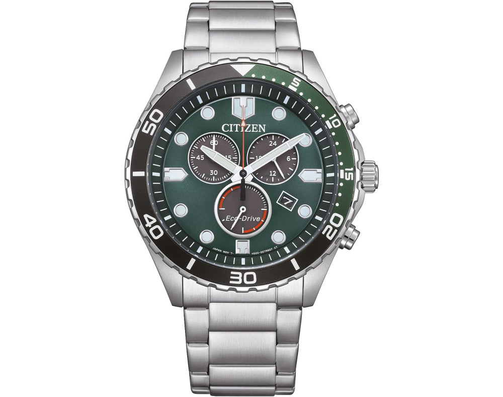 Armbanduhr Citizen Eco-Drive Sporty Aqua AT2561-81X für Herren mit Quarzwerk, Uhrengehäuse aus Edelstahl mit einem Durchmesser von 43 mm, Ziffernblatt Grün und Uhrenarmband aus Edelstahl in der Farbe Silber.