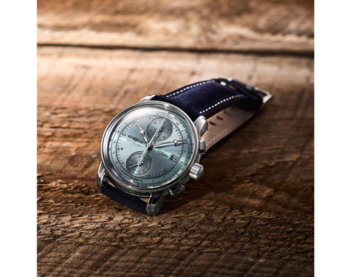 Armbanduhr Zeppelin 100 Years 8670-4 für Herren mit Quarzwerk, Uhrengehäuse aus Edelstahl mit einem Durchmesser von 42 mm, Ziffernblatt Azurblau und Uhrenarmband aus Leder in der Farbe Blau.