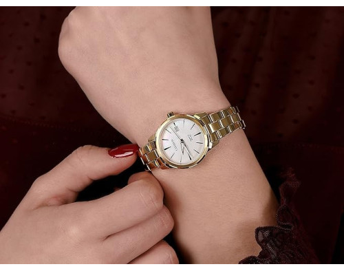 Armbanduhr Citizen Elegance EU6072-56D für Damen mit Quarzwerk, Uhrengehäuse aus Edelstahl mit einem Durchmesser von 28 mm, Ziffernblatt Perlmutt und Uhrenarmband aus Edelstahl in der Farbe Gold.
