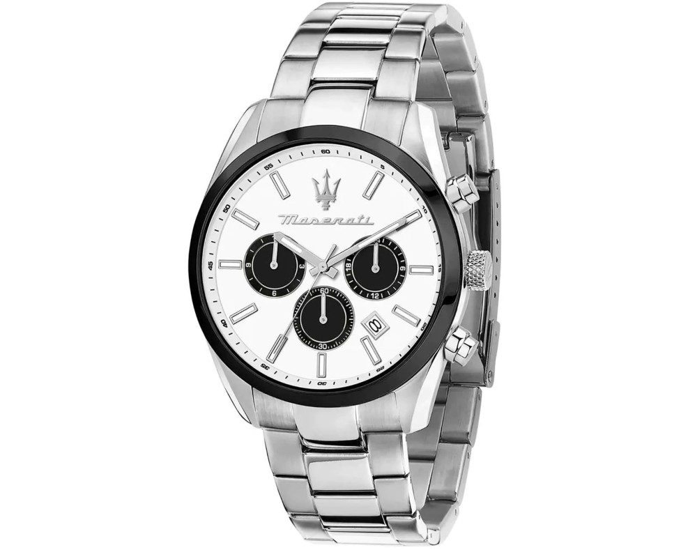 Kvarts Mees Käekell Maserati R8853151004, Roostevaba teras korpusega, läbimõõduga 43 mm, Mineraal klaasist, Valge sihverplaadi ja Hõbedane Roostevaba teras rihm.