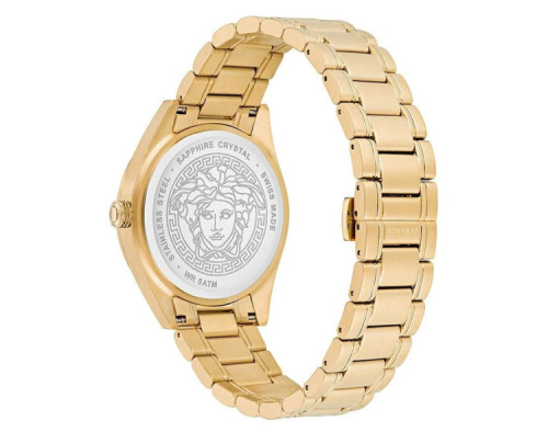 Kvarts Mees Käekell Versace VE6A00623, Roostevaba teras korpusega, läbimõõduga 42 mm, Safiiri töötlusega mineraal klaasist, Must sihverplaadi ja Kuldne Roostevaba teras rihm.