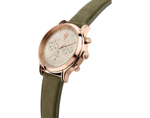 Kvarts Mees Käekell Maserati R8871633007, Roostevaba teras korpusega, läbimõõduga 42 mm, Mineraal klaasist, Beež sihverplaadi ja Roheline Nahk rihm.