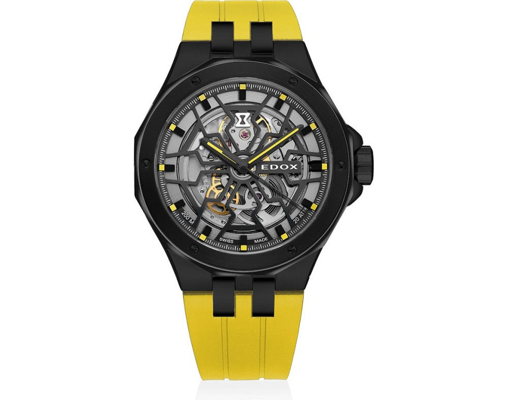 Orologio da polso EDOX Delfin The Original Mecano 85303 37CAJ NJ Analogico Uomo con movimento Meccanico, cassa in Acciaio inossidabile di diametro 43 mm, quadrante Grigio, vetro Minerale con trattamento Zaffiro e cinturino in Gomma di colore Giallo.