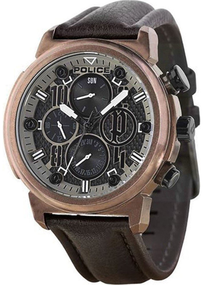 Kvarcas Vyras Rankinis laikrodis Police PL.14250XSQBZ/02 su Nerūdijantis plienas dėklu, 49 mm skersmens, Mineralinis stiklas, Juoda ciferblatu ir Ruda Oda apyranke.