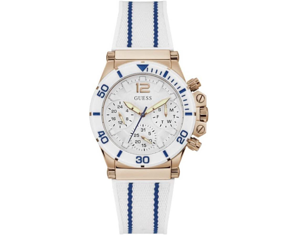 Kvarcas Moteris Rankinis laikrodis Guess GW0406L2 su Nerūdijantis plienas dėklu, 39 mm skersmens, Mineralinis stiklas, Baltas ciferblatu ir Baltas Silikonas apyranke.