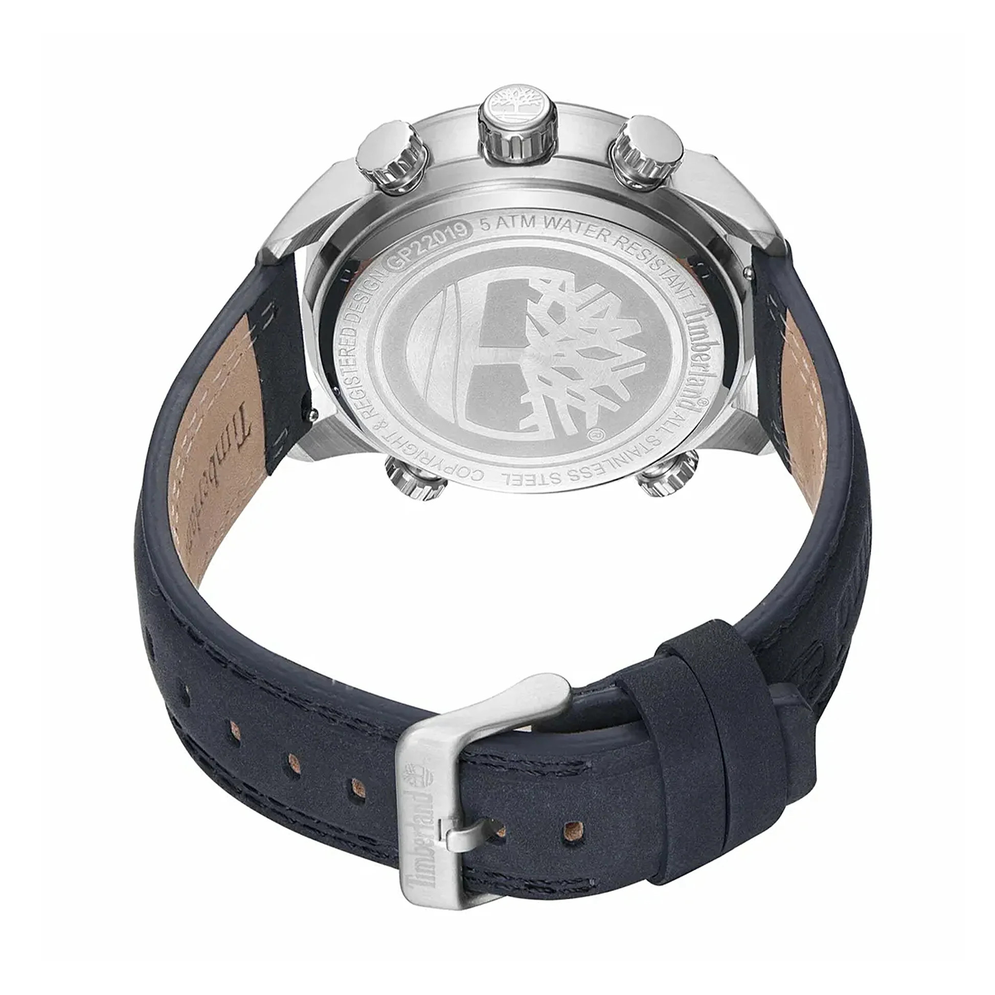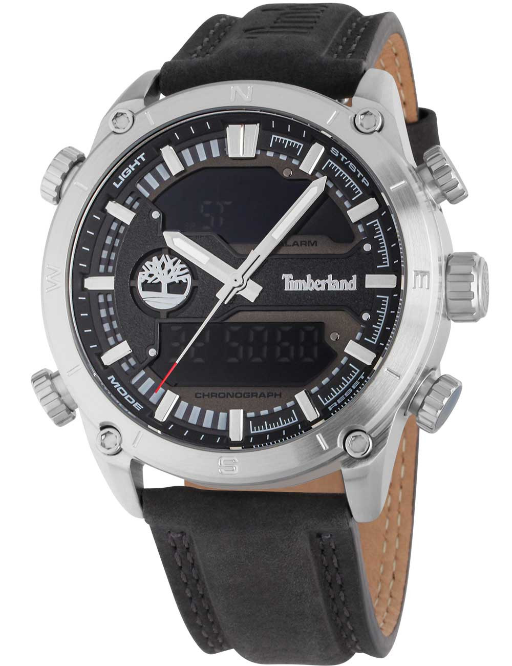 Kvarcas Vyras Rankinis laikrodis Timberland TDWGP2201902 su Nerūdijantis plienas dėklu, 46 mm skersmens, Mineralinis stiklas, Juoda ciferblatu ir Juoda Oda apyranke.