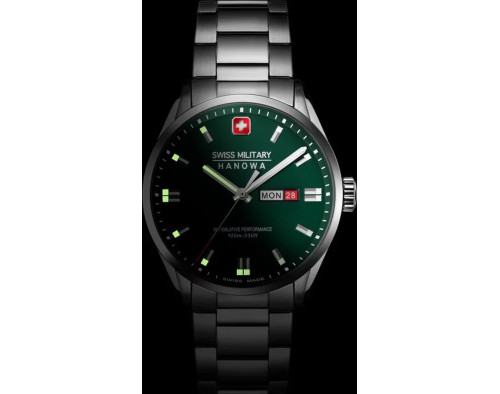Kvarcas Vyras Rankinis laikrodis Swiss Military Hanowa SMWGH0001603 su Nerūdijantis plienas dėklu, 43 mm skersmens, Mineralas su safyru stiklas, Žalias ciferblatu ir Sidabras Nerūdijantis plienas apyranke.