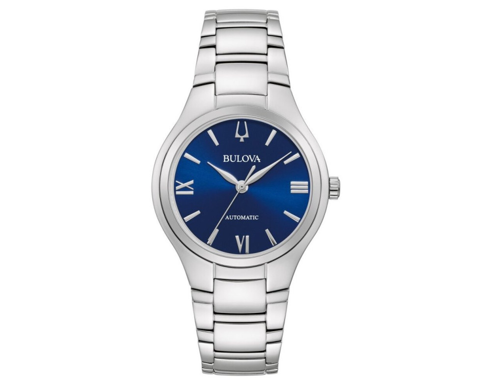 Mechaninis Moteris Rankinis laikrodis Bulova 96L319 su Nerūdijantis plienas dėklu, 34 mm skersmens, Mineralinis stiklas, Mėlyna ciferblatu ir Sidabras Nerūdijantis plienas apyranke.