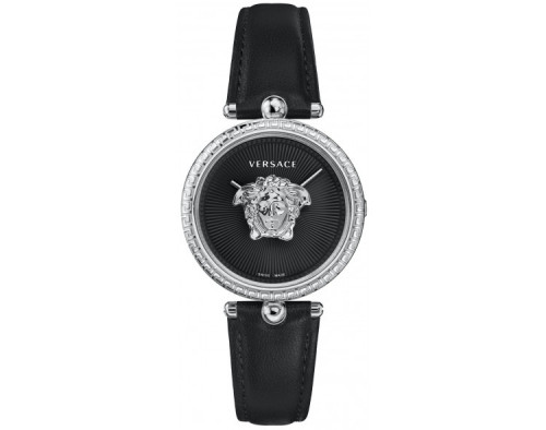 Kvarcs Sieviete Rokas pulkstenis Versace VE8101019 ar Nerūsējošais tērauds korpusu, ar diametru 38 mm, Minerāls ar safīru apstrādi stikls, Melns ciparnīcu un Melns Āda siksnu.
