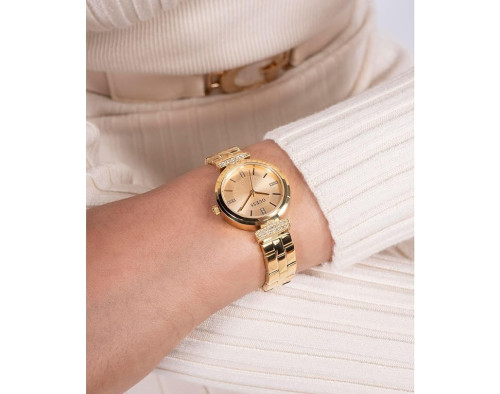 Kvarcs Sieviete Rokas pulkstenis Guess GW0762L2 ar Nerūsējošais tērauds korpusu, ar diametru 28 mm, Minerāls stikls, Zelts ciparnīcu un Zelts Nerūsējošais tērauds siksnu.