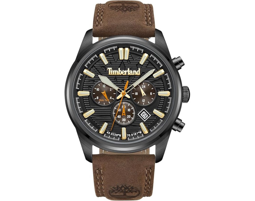 Кварц Мужчина Наручные часы Timberland TDWGF0009603, корпус Нержавеющая сталь, диаметр 45 mm, Минеральная стекло, Черный циферблат и Коричневый Кожа ремешок.