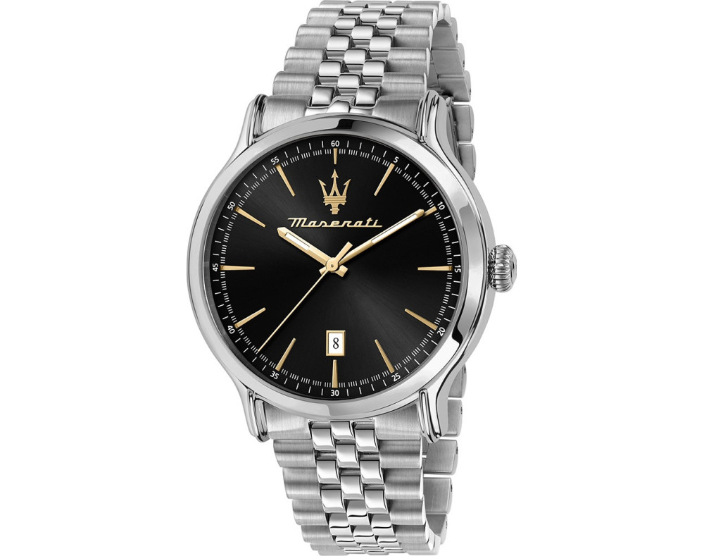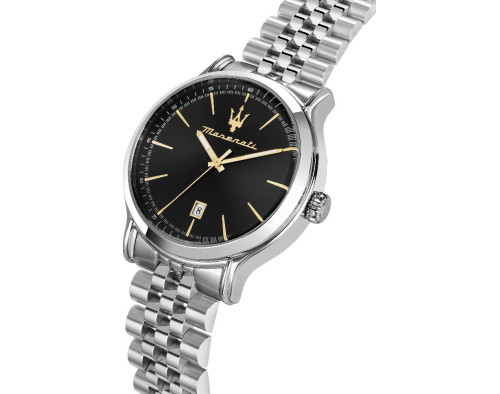 Кварц Мужчина Наручные часы Maserati R8853118024, корпус Нержавеющая сталь, диаметр 42 mm, Минеральная стекло, Черный циферблат и Серебро Нержавеющая сталь ремешок.