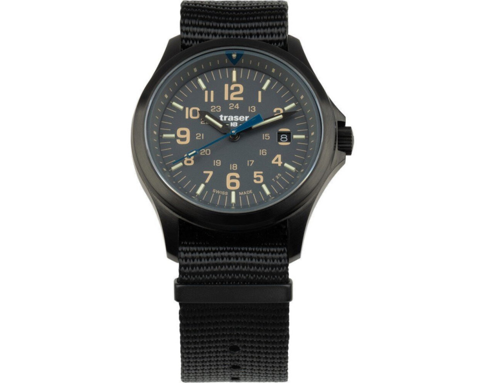Кварц Мужчина Наручные часы Traser 111072, корпус Нержавеющая сталь, диаметр 42 mm, Минерал с обработкой сапфиром стекло, Серый циферблат и Черный Салфетка ремешок.