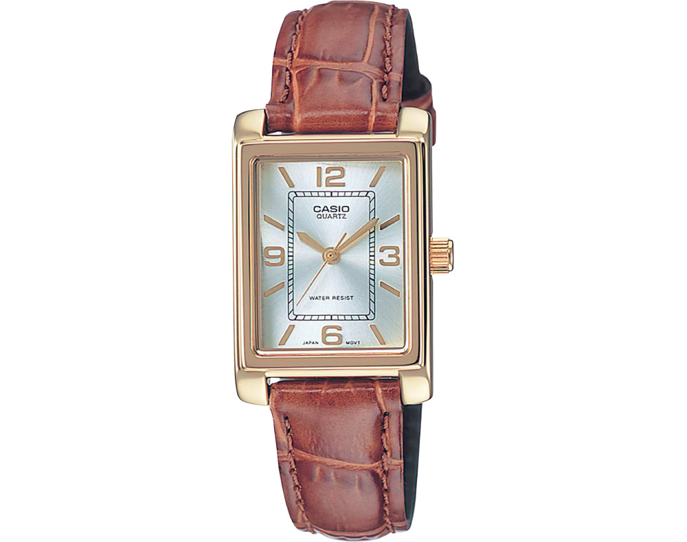 Кварц Женщина Наручные часы Casio LTP-1234PGL-7AEG, корпус Латунь, диаметр 21 mm, Минеральная стекло, Серебро циферблат и Коричневый Кожа ремешок.