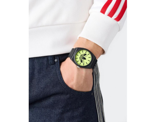 Кварц унисекс Наручные часы Adidas AOST25549, корпус Смола, диаметр 38 mm, Акрил стекло, Желтый циферблат и Черный Силикон ремешок.