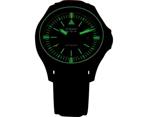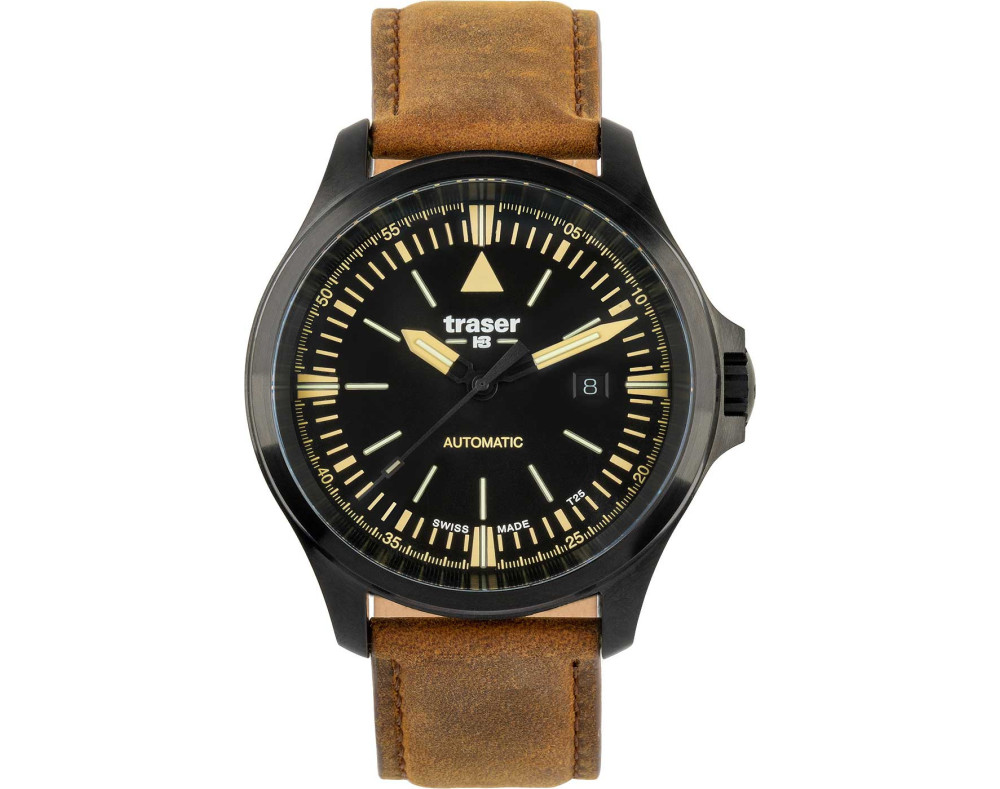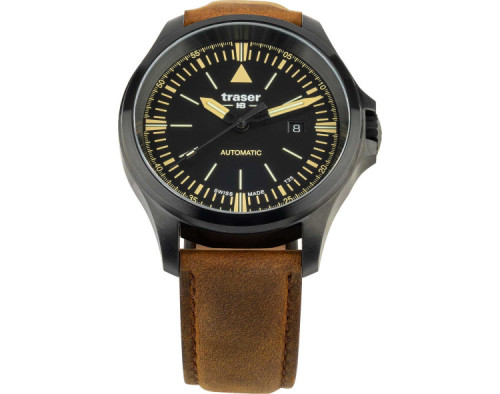 механический Мужчина Наручные часы Traser 110756, корпус Нержавеющая сталь, диаметр 45 mm, Минерал с обработкой сапфиром стекло, Черный циферблат и Коричневый Кожа ремешок.