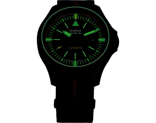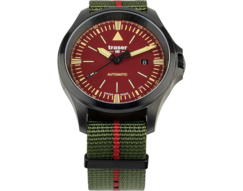 механический Мужчина Наручные часы Traser 110757, корпус Нержавеющая сталь, диаметр 45 mm, Минерал с обработкой сапфиром стекло, Красный циферблат и Зеленый Салфетка ремешок.