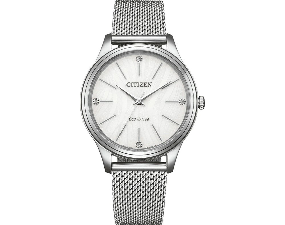 Кварц Женщина Наручные часы Citizen EM1220-82A, корпус Нержавеющая сталь, диаметр 34 mm, Минеральная стекло, Белый циферблат и Серебро миланская рубашка ремешок.