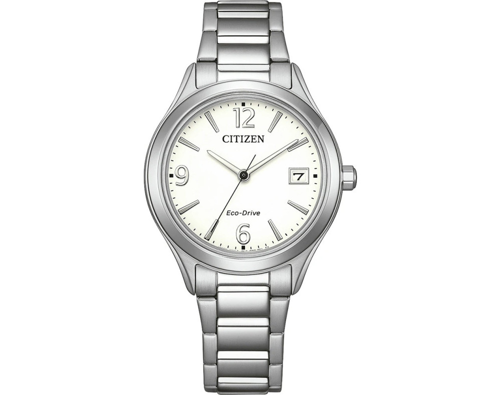 Кварц Женщина Наручные часы Citizen FE6121-67A, корпус Нержавеющая сталь, диаметр 34 mm, Минеральная стекло, Белый циферблат и Серебро Нержавеющая сталь ремешок.