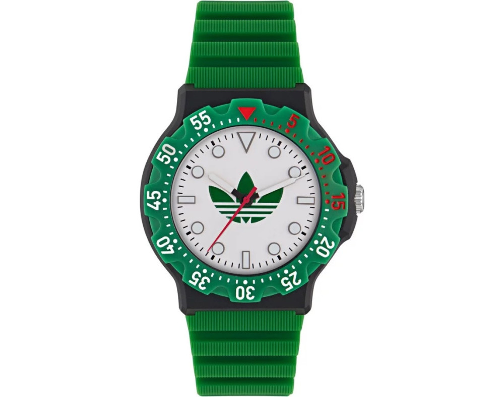 Armbanduhr Adidas Discoverer Two AOSY25512 für Unisex mit Quarzwerk, Uhrengehäuse aus Resin mit einem Durchmesser von 40 mm, Ziffernblatt Weiß und Uhrenarmband aus Silikon in der Farbe Grün.