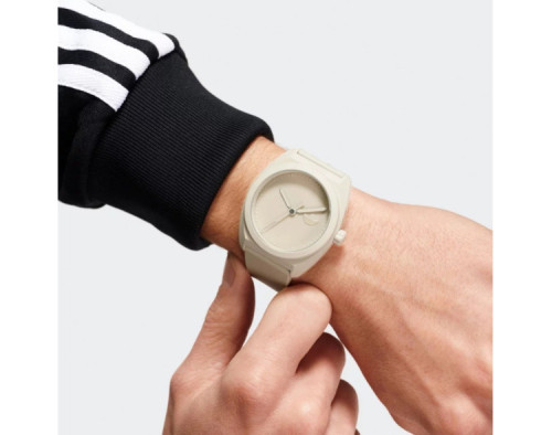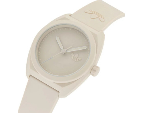 Armbanduhr Adidas Project Three AOST24055 für Unisex mit Quarzwerk, Uhrengehäuse aus Keramik mit einem Durchmesser von 42 mm, Ziffernblatt Beige und Uhrenarmband aus Silikon in der Farbe Beige.