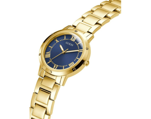 Armbanduhr Guess Dawn GW0404L4 für Damen mit Quarzwerk, Uhrengehäuse aus Edelstahl mit einem Durchmesser von 34 mm, Ziffernblatt Blau und Uhrenarmband aus Edelstahl in der Farbe Gold.
