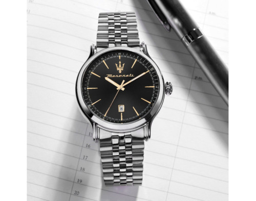 Armbanduhr Maserati Epoca R8853118024 für Herren mit Quarzwerk, Uhrengehäuse aus Edelstahl mit einem Durchmesser von 42 mm, Ziffernblatt Schwarz und Uhrenarmband aus Edelstahl in der Farbe Silber.