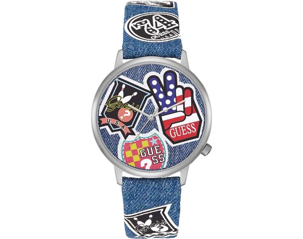 Armbanduhr Guess V1004M1 für Unisex mit Quarzwerk, Uhrengehäuse aus Edelstahl mit einem Durchmesser von 42 mm, Ziffernblatt Mehrfarbig und Uhrenarmband aus Leder in der Farbe Blau.